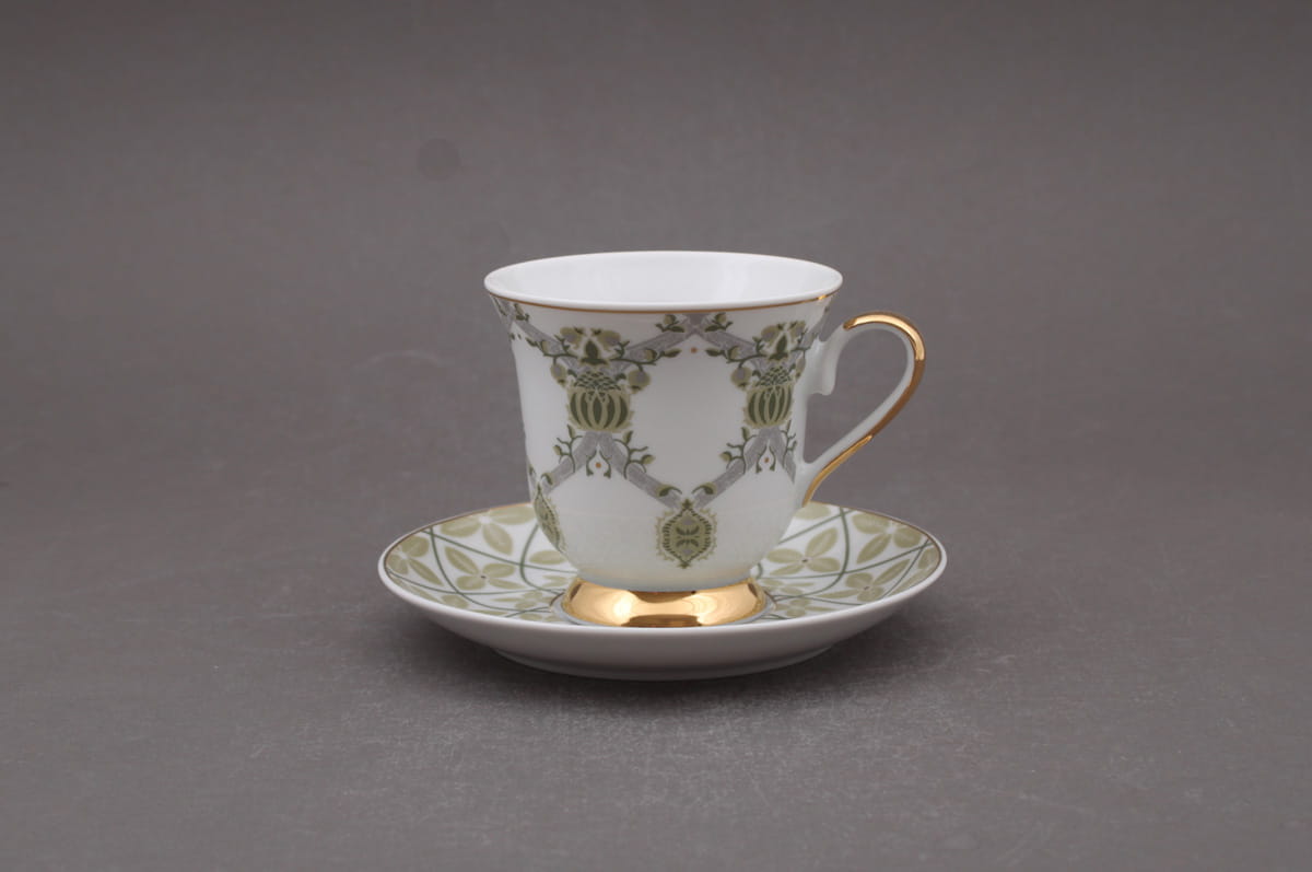 Pojedyncza filiżanka do kawy ze spodkiem z Fabryki Porcelany w Ćmielowie. Z delikatnie, zieloną dekoracją.