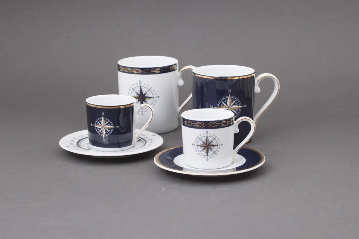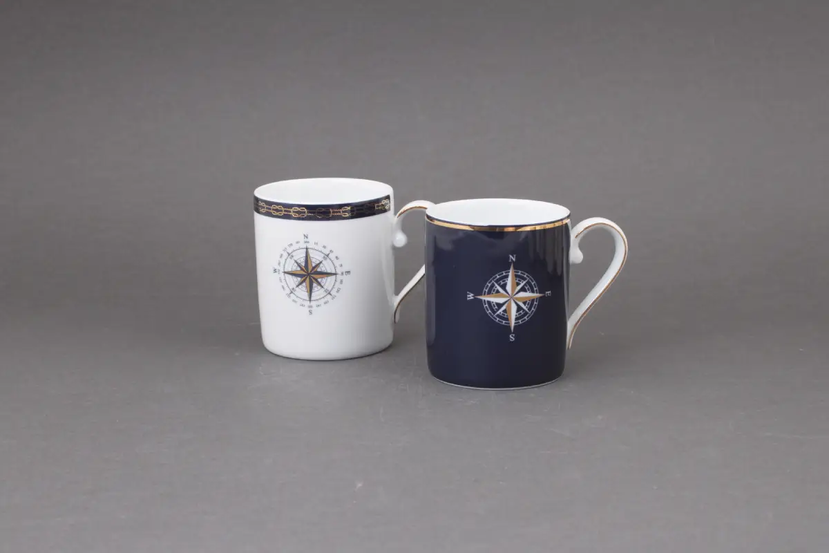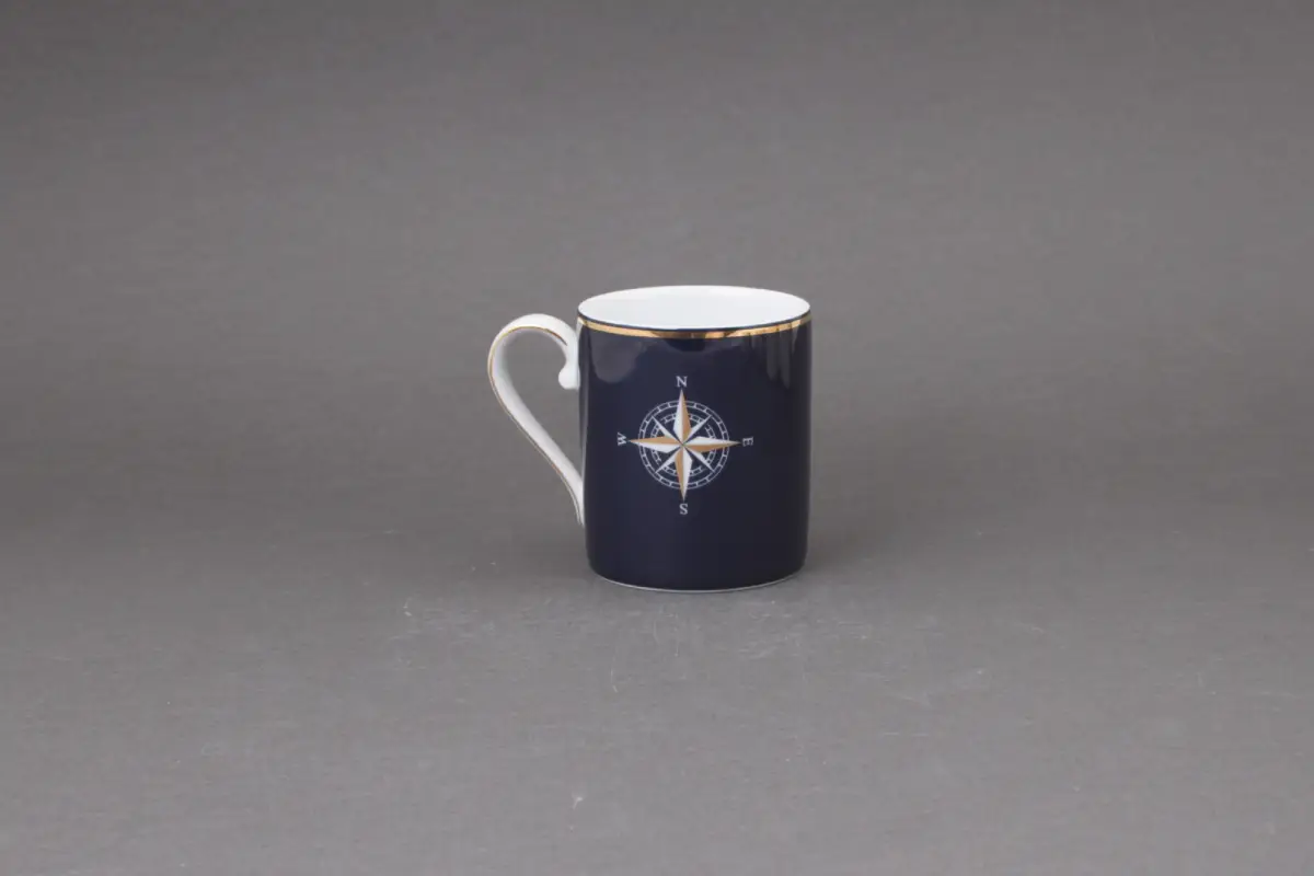 Motyw róży wiatrów, umieszczony centralnie na kubku, to nawiązanie do świata żeglarstwa oraz do uniwersalnych wartości takich jak odkrywanie, niezależność i poszukiwanie nowych ścieżek. W połączeniu z głębokim granatem porcelany przywodzi na myśl bezkresne morze i gwiaździste niebo.
