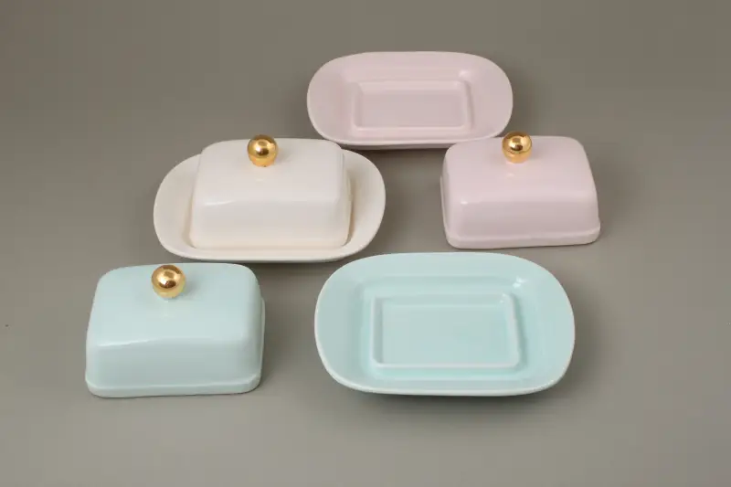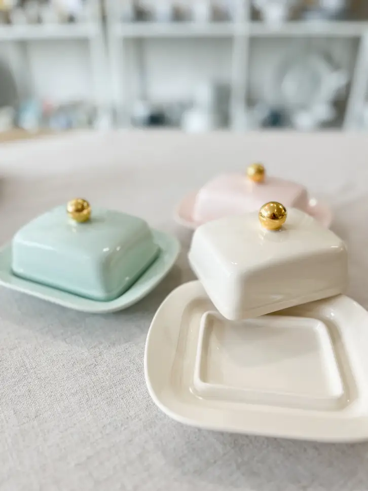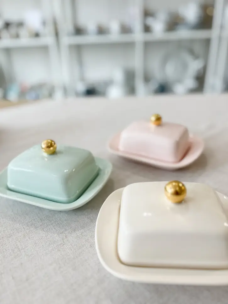 Ładna maselniczka to poszukiwane naczynie. W ofercie maselniczki z chodzieskiej ceramiki w trzech kolorach - kremowym, różowym i miętowym. Każda pokrywka ozdobiona złotą kulką.
