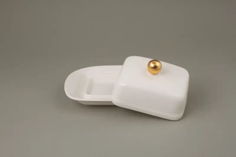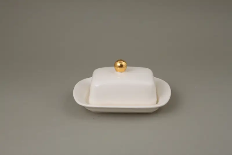 Klasyczna, ceramiczna maselniczka ze złotą kulką w pokrywce. Pojemnik na masło ma 8,5 cm długości i 6 cm szerokości - pomieści małą osełkę czy pół klasycznej kostki masła.