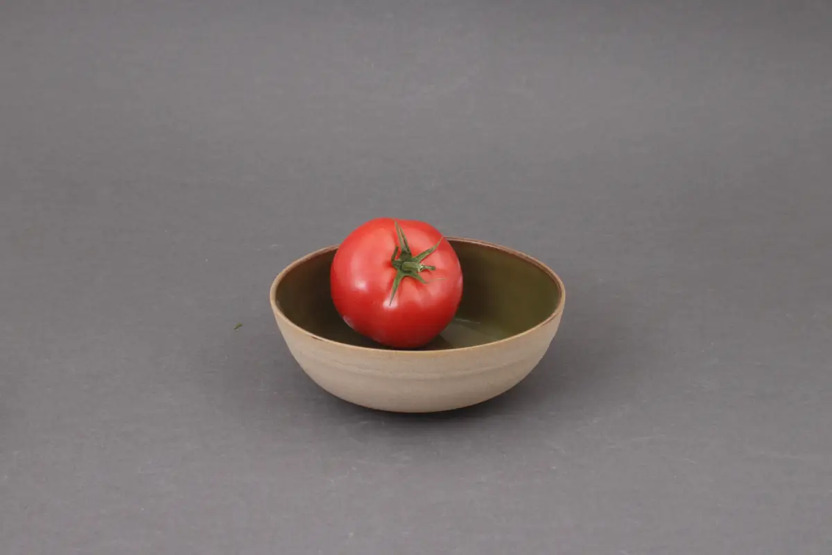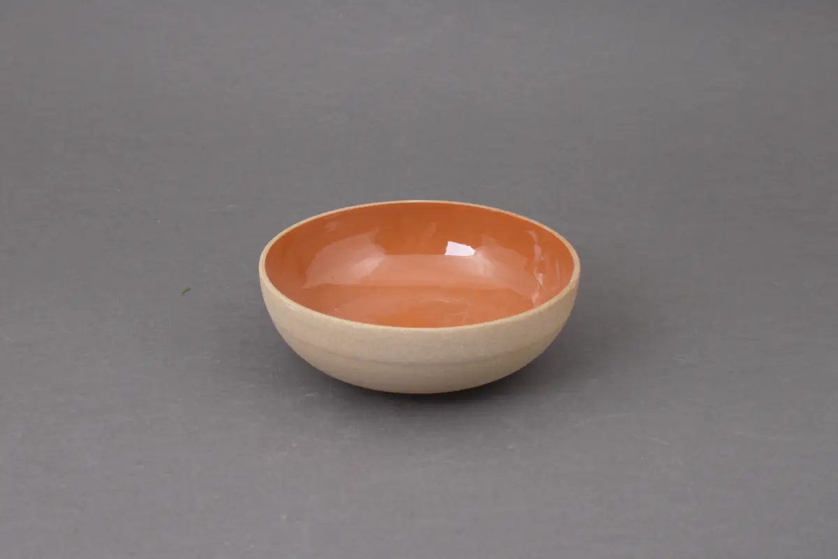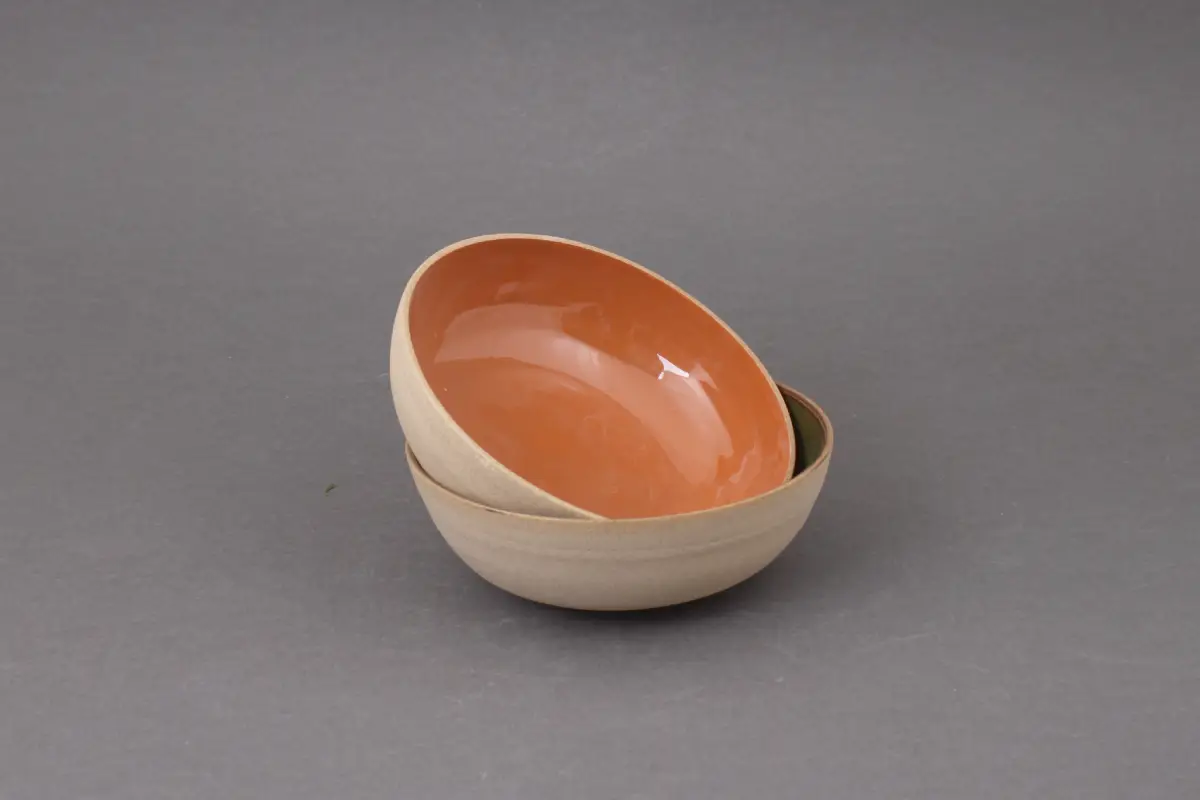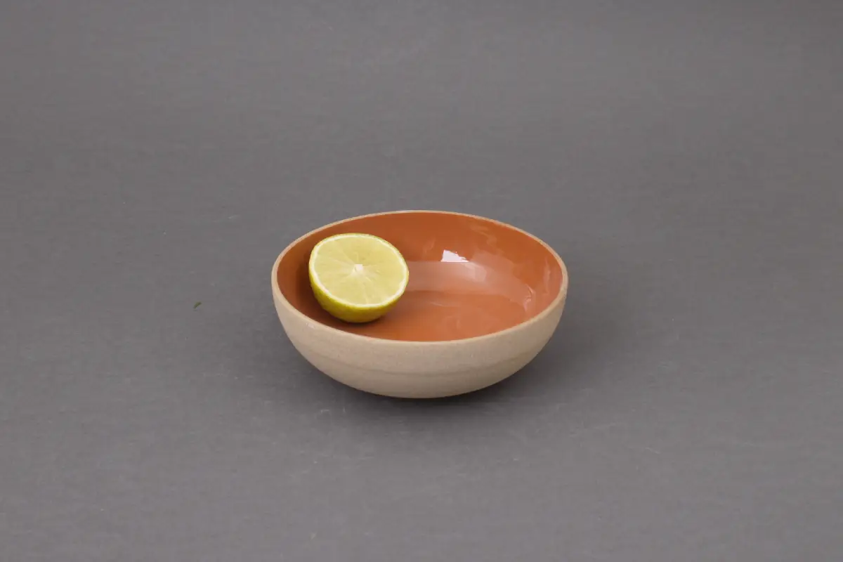 Z zewnątrz miska zachowuje naturalny, nieszkliwiony odcień toffi, który podkreśla surowość materiału. Wnętrze pokryte jest błyszczącym szkliwem.