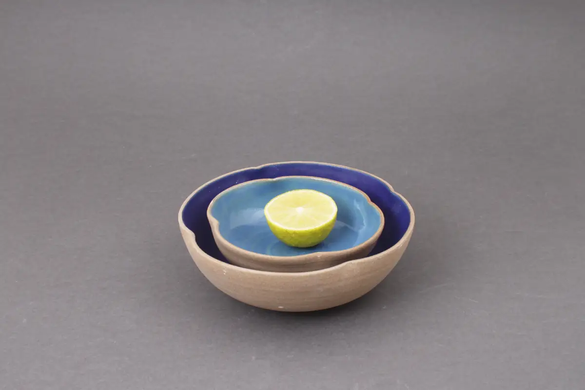 Z zewnątrz miska zachowuje naturalny, nieszkliwiony odcień toffi, który podkreśla surowość materiału. Wnętrze pokryte jest kobaltowym szkliwem o satynowym wykończeniu, przyjemnym w dotyku. Delikatnie nieregularne, lekko pofalowane brzegi nadają jej formę inspirowaną kwiatem.